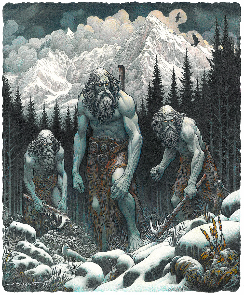 Obři se začali mezi sebou hlasitě radit a jejich burácivé hlasy zněly jako hromy nad horami a odrážely se ve zvlněném reliéfu temného lesa. "Cítím něco, co sem nepatří, páchne to jako člověčina! Myslím si, že máme na svém území vetřelce," zahřměl jeden z obrů a jeho obrovské ledové oči zazářily v temnotě.