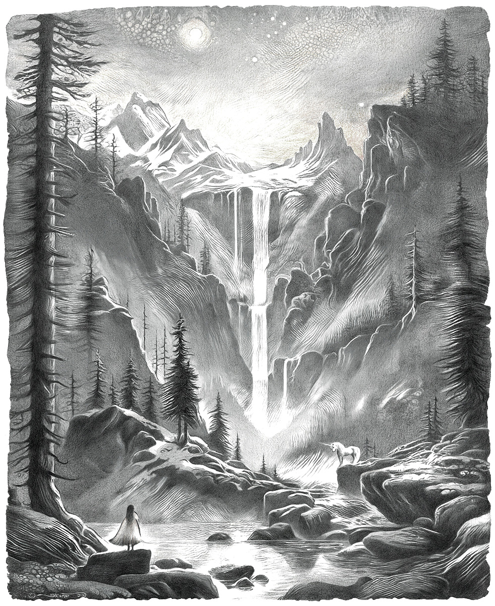 Stála tam tiše a promáčená deštěm. Dívala se dlouho do padající vodní tříště, v níž se lámaly barvy světla, dokud v proudu vody nezahlédla stín. Nejasný pohyb, v němž se soustředila síla celého bytí. Elva se zhluboka nadechla s poznáním v srdci, že znovu překročila práh mezi dimenzemi. Z mlžného oparu vystoupil jednorožec, ozářený bledým světlem dávných snů.